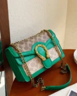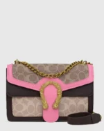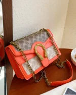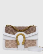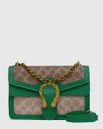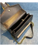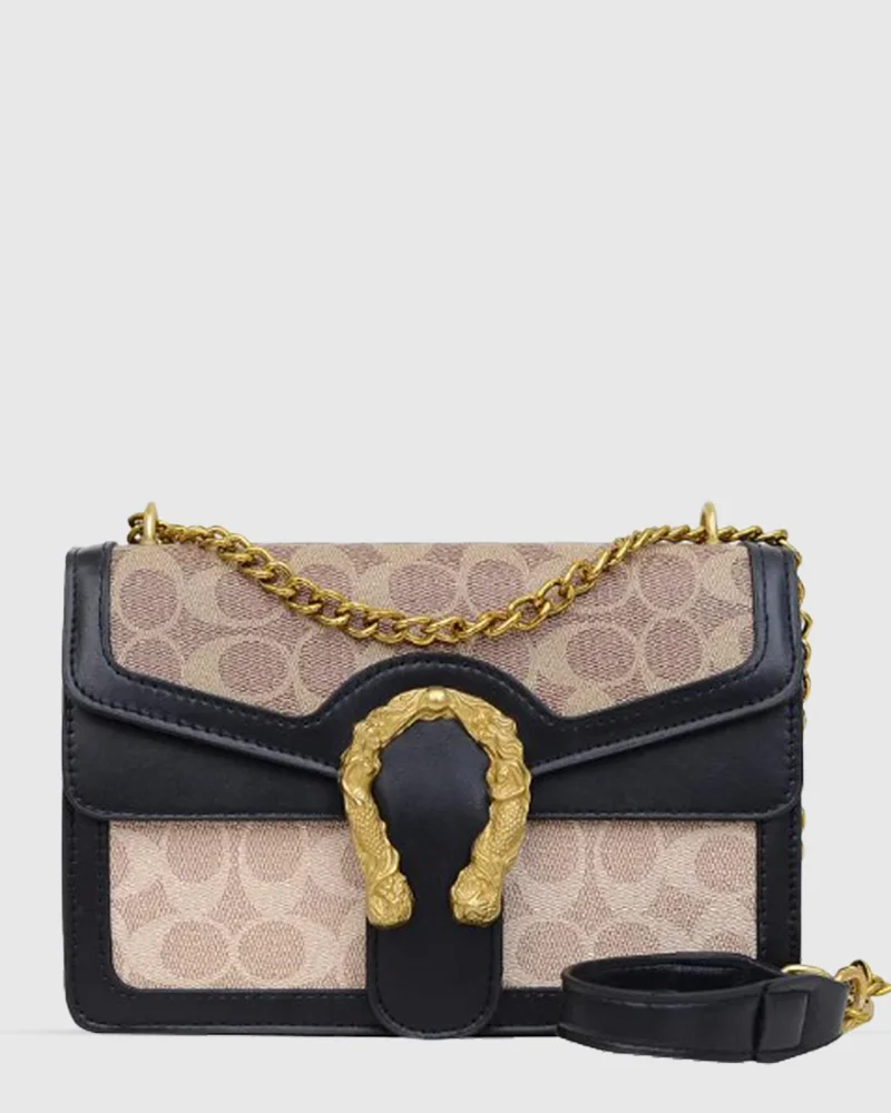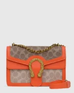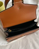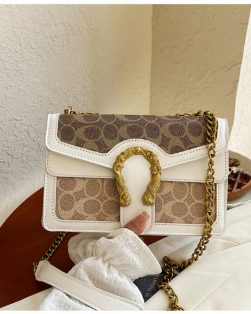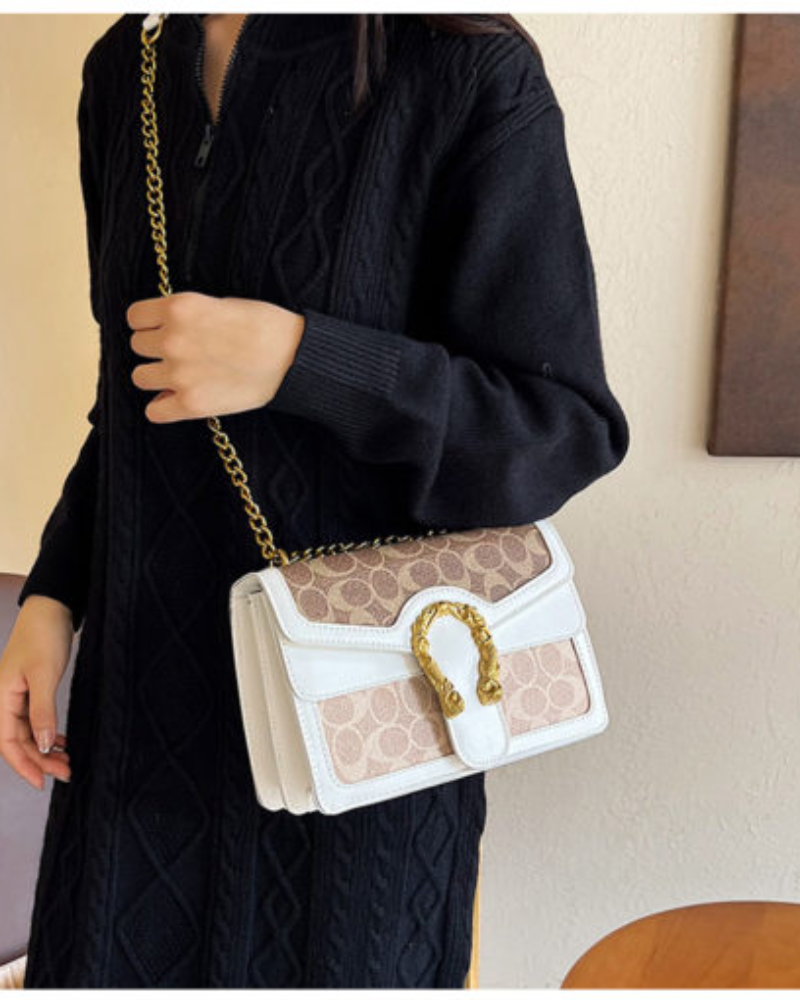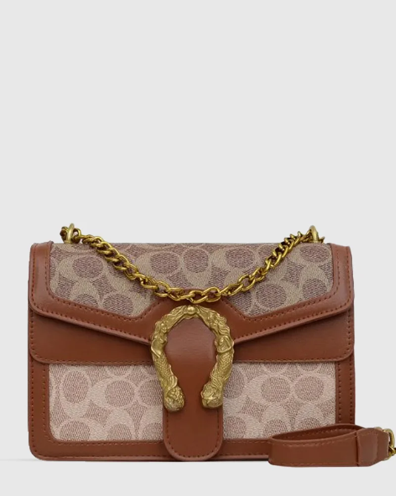 This saddlebag showcases rich caramel accents paired with a sophisticated golden chain detail. Its timeless design and classic pattern make it a versatile luxury piece, perfect for elevating any look with understated elegance.