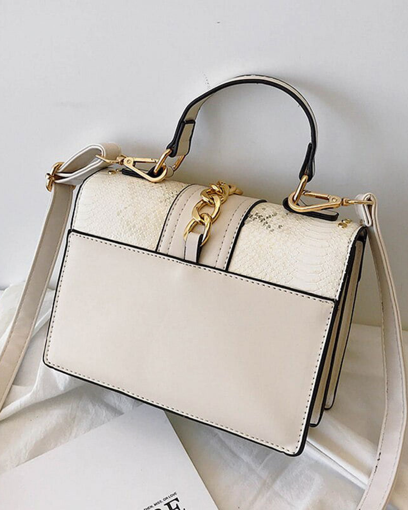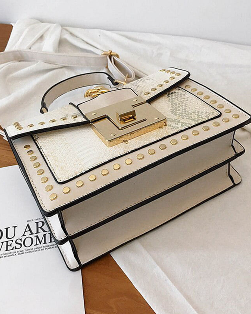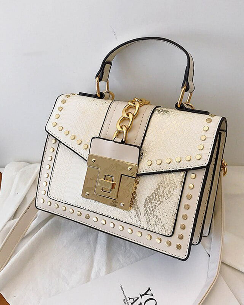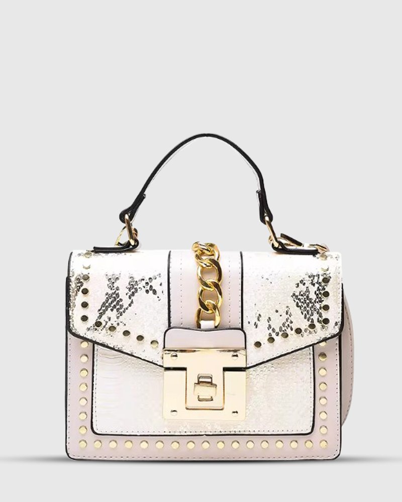This luxurious satchel features a bold snakeskin pattern and striking golden chain accents, with its structured design and studded detailing, it adds a touch of modern elegance to any outfit. Perfect for making a stylish statement, this bag effortlessly combines glamour and sophistication.