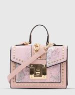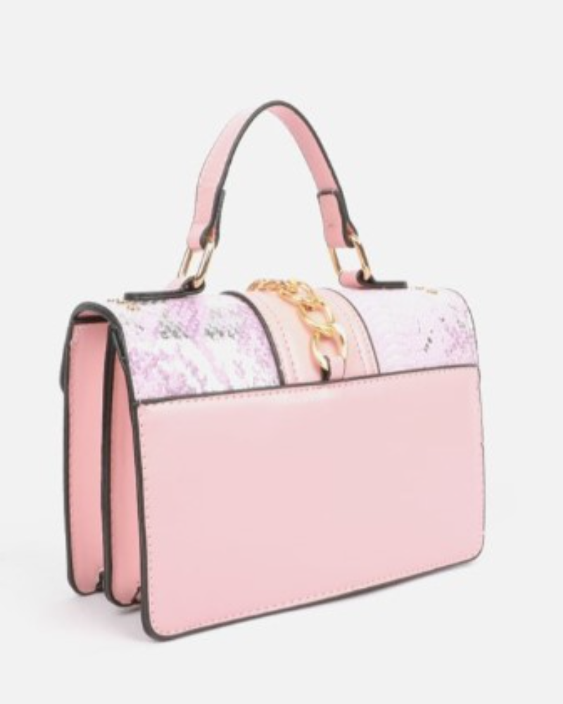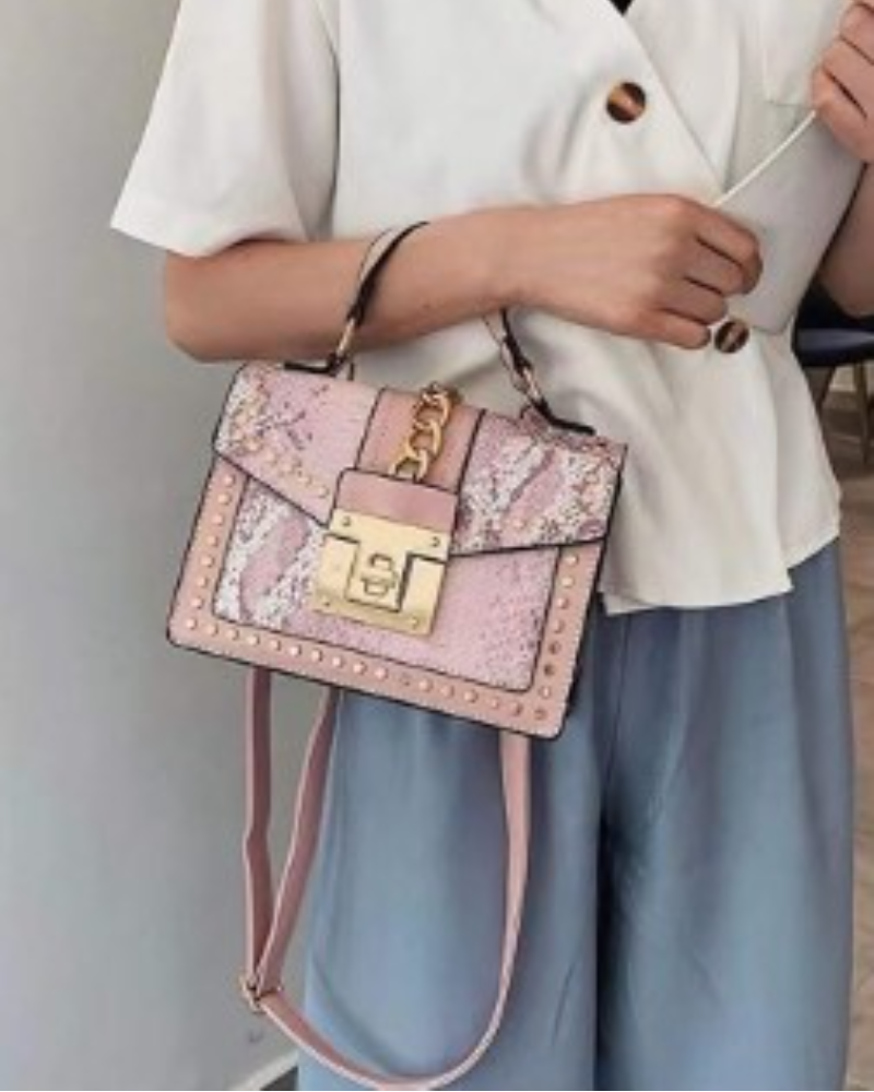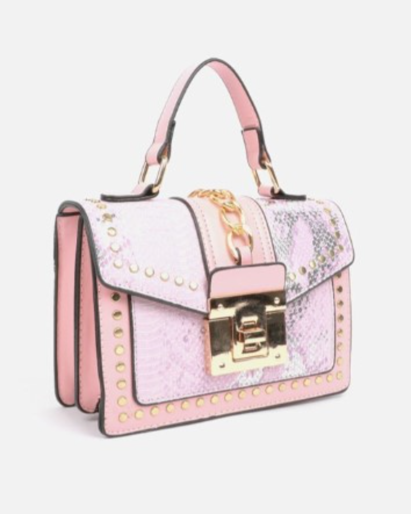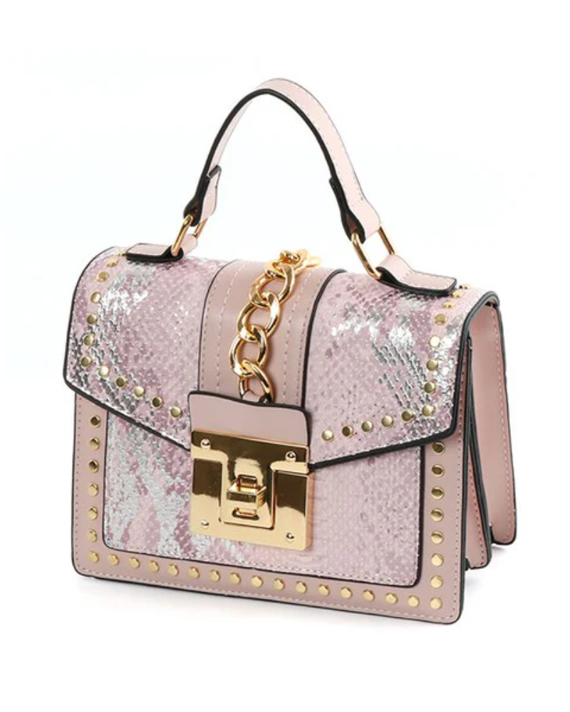This luxurious satchel features a bold snakeskin pattern and striking golden chain accents. With its structured design and studded detailing, it adds a touch of modern elegance to any outfit. Perfect for making a stylish statement, this bag effortlessly combines glamour and sophistication.