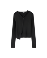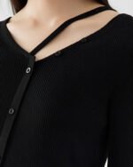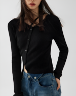 Be the first to review “Women’s Black Ribbed Button-Up Shirt with Cross Strap– Chic and Casual Style”