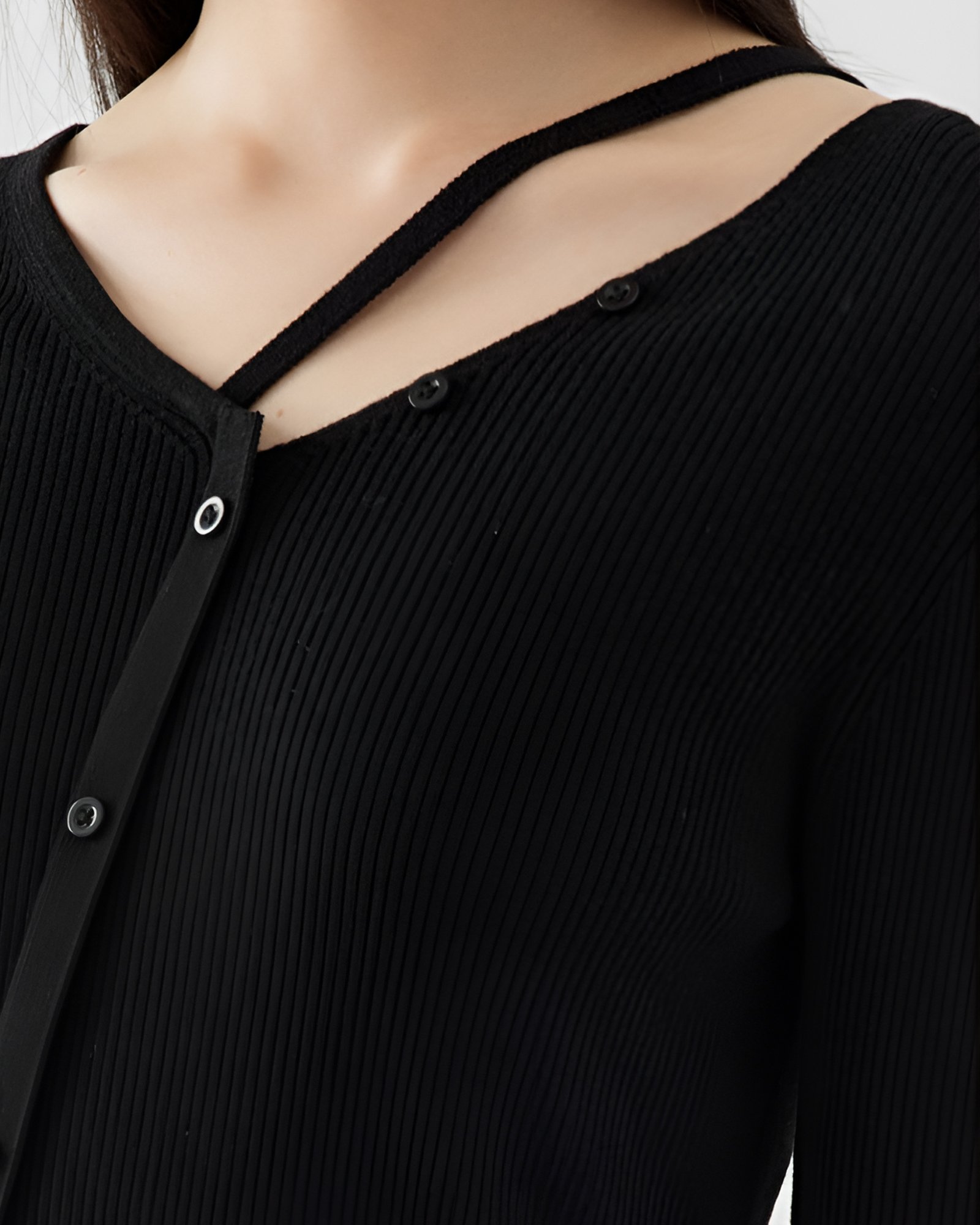 Women’s Black Ribbed Button-Up Shirt with Cross Strap– Chic and Casual Style
